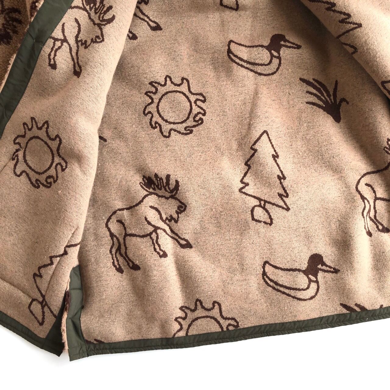 warmingでおなじみのヘラジカやカモ、そして佐藤氏を象徴する 太陽のモチーフを組み合わせ、完全描き下ろしのイラストを生地に落とし込んで製作しました。生地そのものを一から織り上げたスペシャルな一着です。